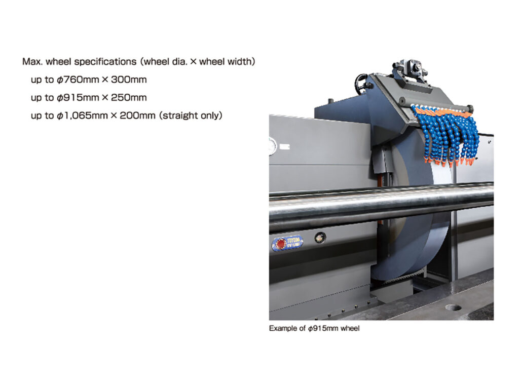 We have prepared a wheel diameter of ⌀1,065mm to make the grinding of workpieces with significant swing possible.By using a wheel spindle with an even higher rigidity, machining with a wheel width of 300mm has been made possible.
